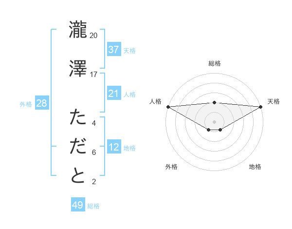 瀧澤 ただとさんを姓名の画数から五運を鑑定