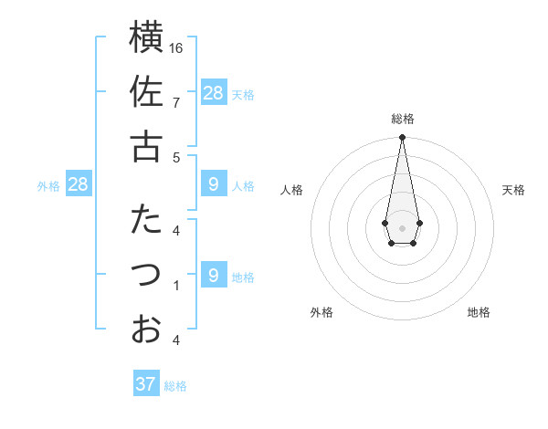 横佐古 たつおさんの総格は37画の5点!