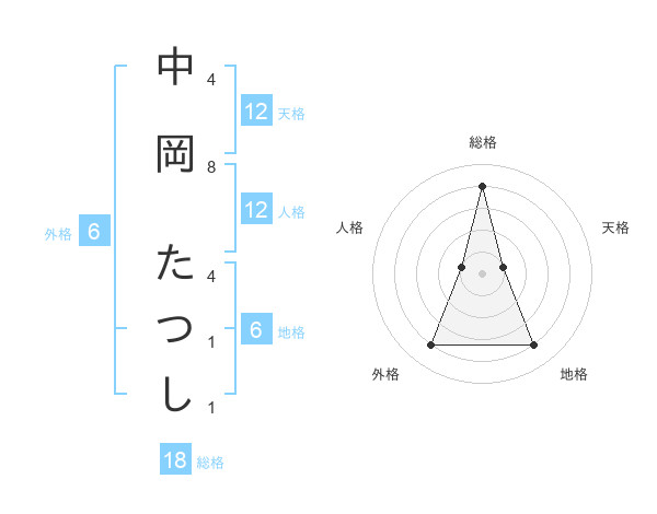 中岡 たつしさんの総格は18画の4点