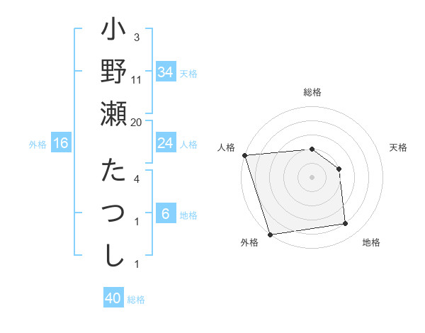 小野瀬 たつしさんを姓名の画数から五運を鑑定