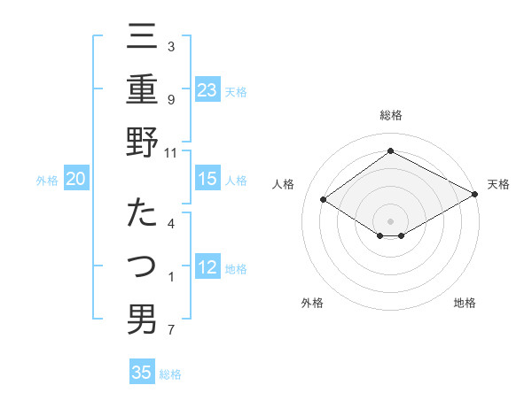 三重野 たつ男さんを姓名の画数から五運を鑑定