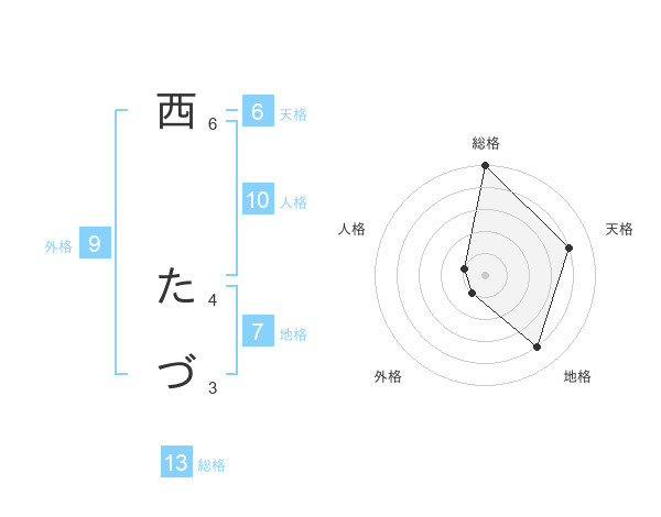 西 たづさんの総格は13画の5点!