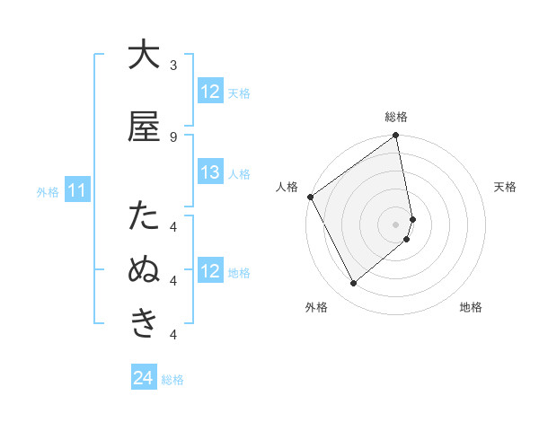 大屋 たぬきさんの地格は12画の1点!