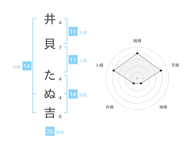 井貝 たぬ吉さんの総格は25画の4点!