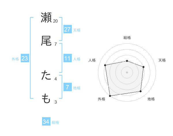 瀬尾 たもさんの総格は34画の2点!