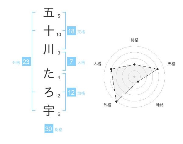 五十川 たろ宇さんを姓名の画数から五運を鑑定
