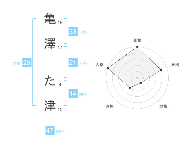 亀澤 た津さんを姓名の画数から五運を鑑定