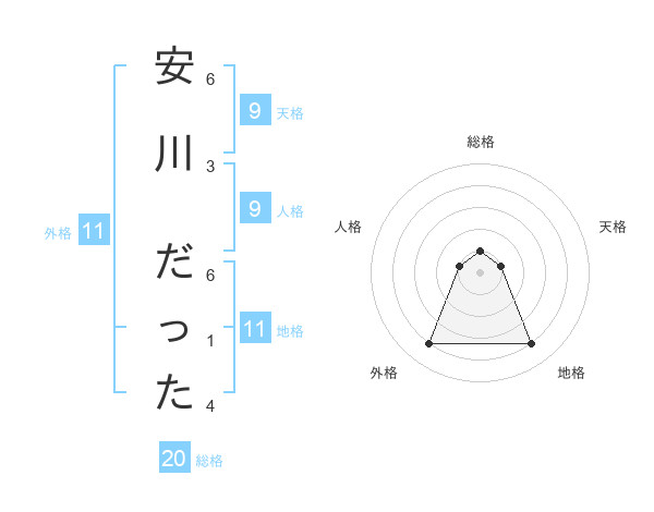 占い結果は姓名判断である以上、良い場合も悪い場合もありますが、決してお名前を誹謗中傷するものでなく、画数の自動計算によって得られたものです。また、本サイトの検索によって得られた鑑定結果で、第三者を誹謗中傷したり名誉を棄損するような行為を禁じます。