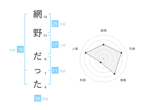 占い結果は姓名判断である以上、良い場合も悪い場合もありますが、決してお名前を誹謗中傷するものでなく、画数の自動計算によって得られたものです。また、本サイトの検索によって得られた鑑定結果で、第三者を誹謗中傷したり名誉を棄損するような行為を禁じます。