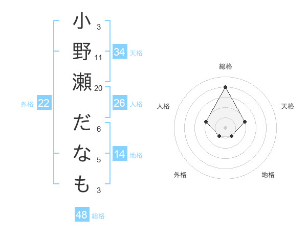 小野瀬 だなもさんの総格は48画の4点!