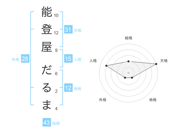 能登屋 だるまさんの総格は43画の2点!