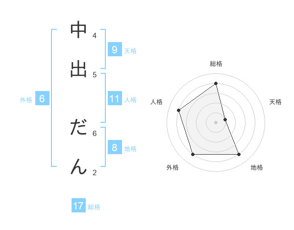 中出 だんさんの総格は17画の4点!