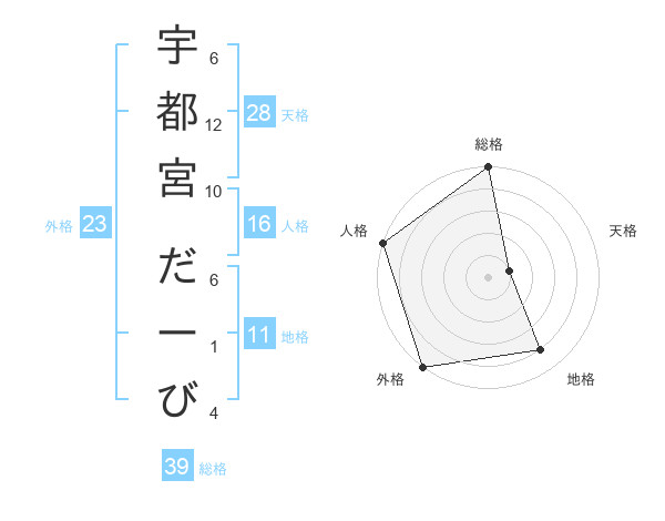 宇都宮 だーびさんの総格は39画の5点!