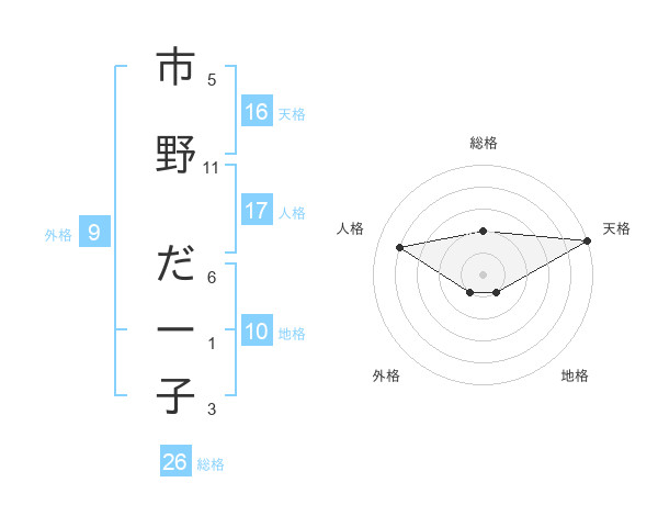 市野 だー子さんの天格は16画の5点!
