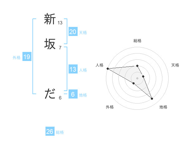 新坂 ださんの総格は26画の2点!