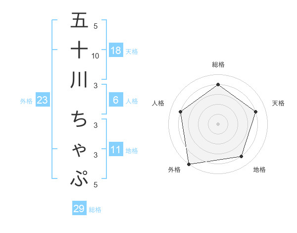 五十川 ちゃぷさんを姓名の画数から五運を鑑定