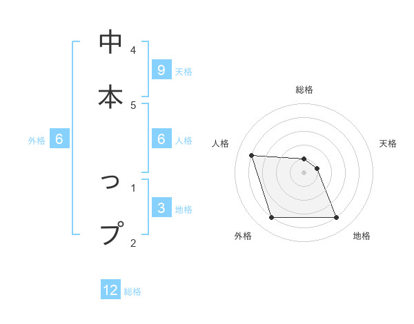 中本 っプさんの総格は12画の1点!