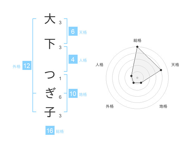 大下 つぎ子さんの総格は16画の5点!
