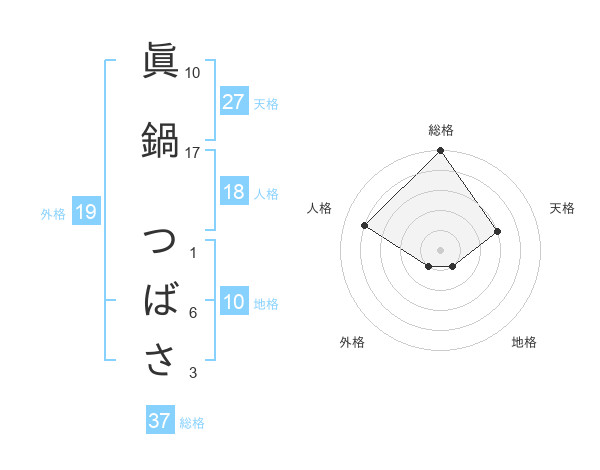 眞鍋 つばささんの総格は37画の5点!