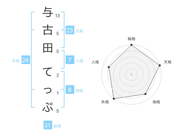与古田 てっぷさんを姓名の画数から五運を鑑定