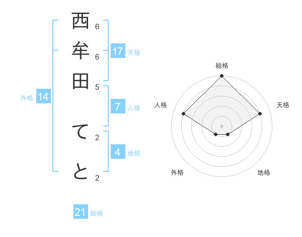 西牟田 てとさんの総格は21画の5点!