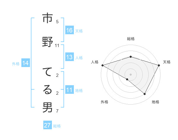 市野 てる男さんの総格は27画の3点!