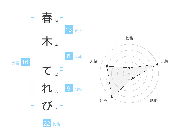 春木 てれびさんの総格は22画の1点!