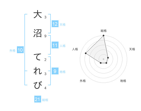大沼 てれびさんを姓名の画数から五運を鑑定