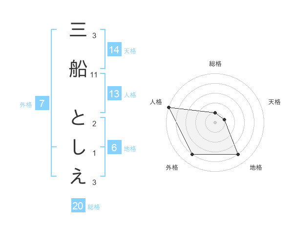 三船 としえさんの総格は20画の1点!