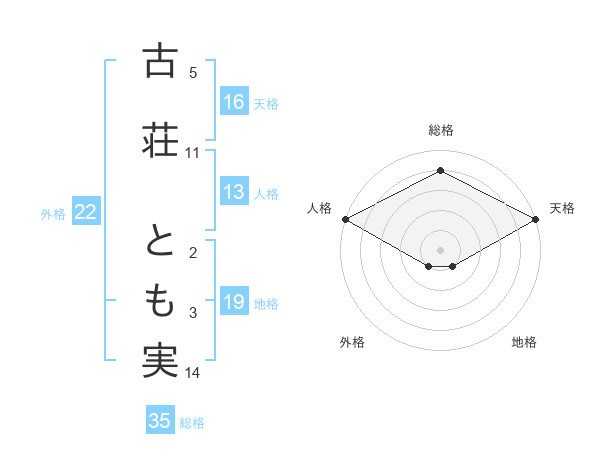 古荘 とも実さんを姓名の画数から五運を鑑定
