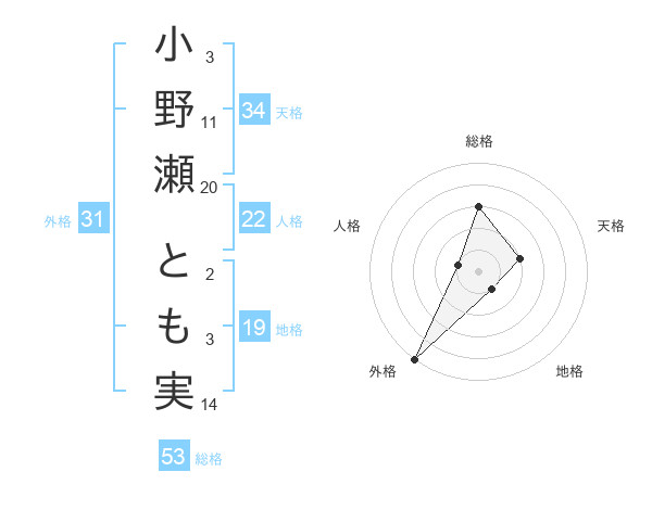 小野瀬 とも実さんを姓名の画数から五運を鑑定