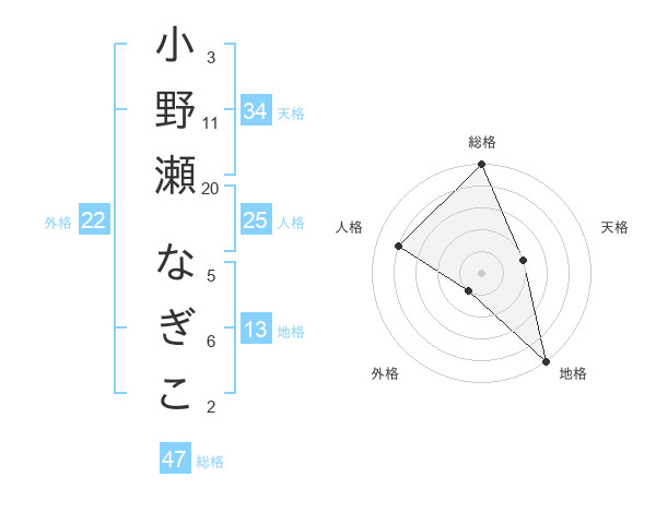 小野瀬 なぎこさんの総格は47画の5点!