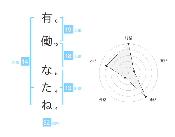 有働 なたねさんの地格は13画の5点!
