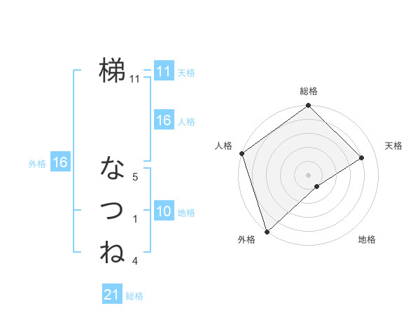 梯 なつねさんの総格は21画の5点!