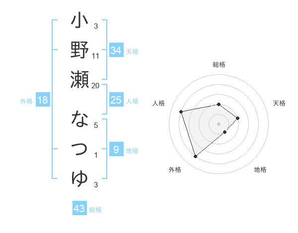 小野瀬 なつゆさんを姓名の画数から五運を鑑定