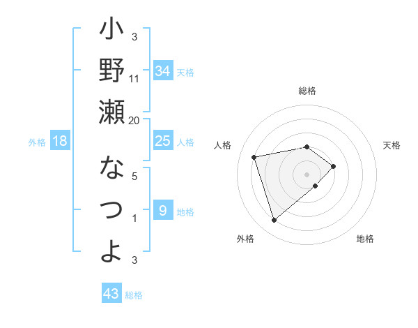 小野瀬 なつよさんの総格は43画の2点