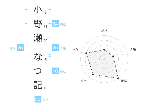 小野瀬 なつ記さんの総格は50画の2点