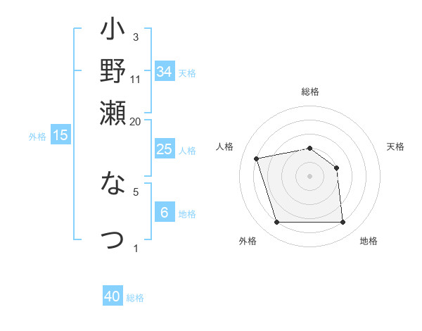 小野瀬 なつさんを姓名の画数から五運を鑑定
