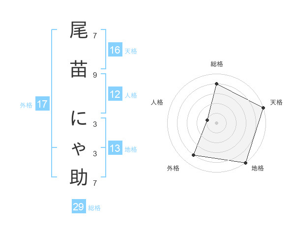 尾苗 にゃ助さんの総格は29画の4点!
