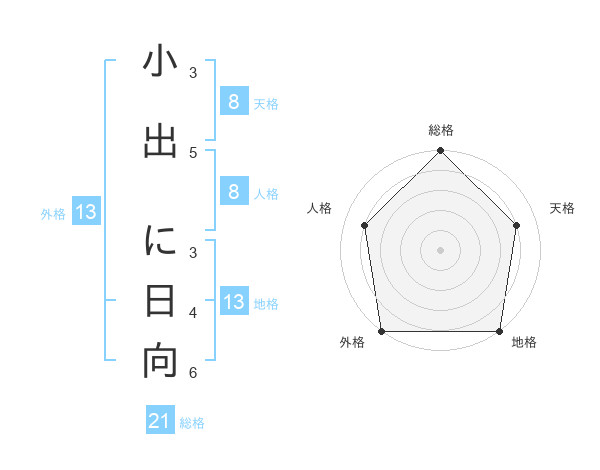 小出 に日向さんの総格は21画の5点!