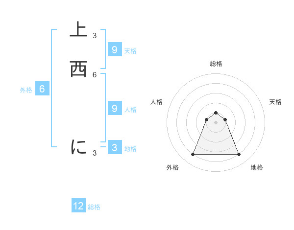 上西 にさんの総格は12画の1点!