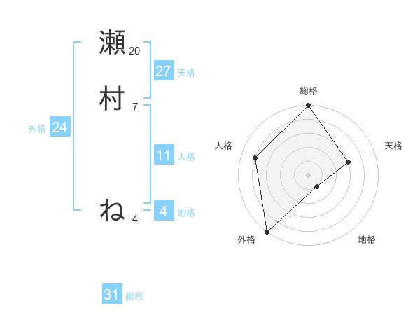 瀬村 ねさんの総格は31画の5点!