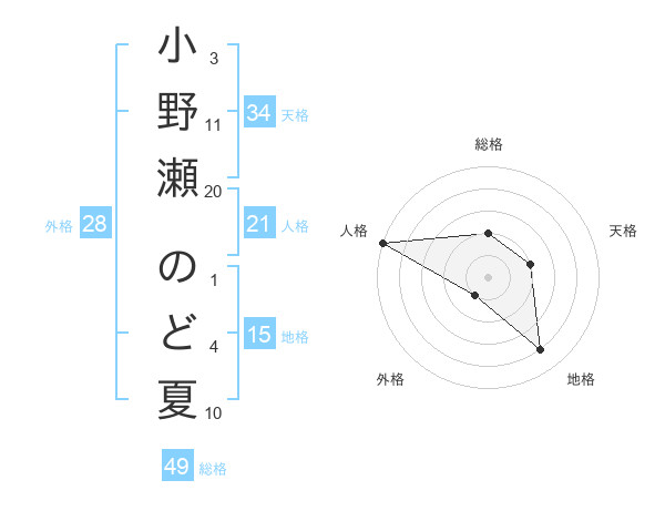小野瀬 のど夏さんを姓名の画数から五運を鑑定
