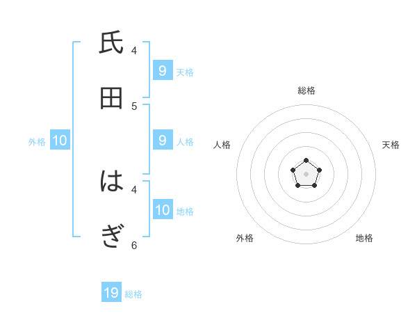 氏田 はぎさんの総格は19画の1点!