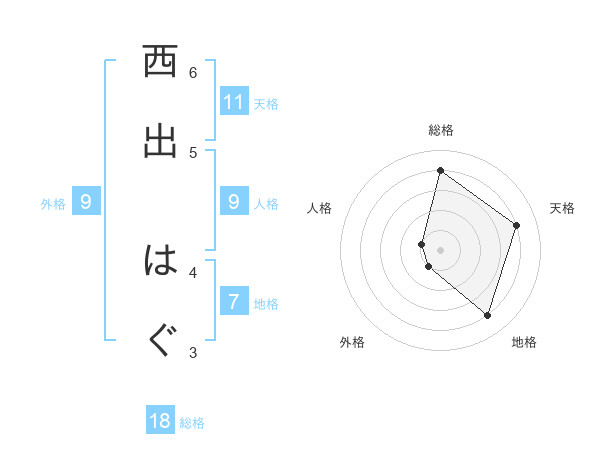 西出 はぐさんの外格は9画の1点!