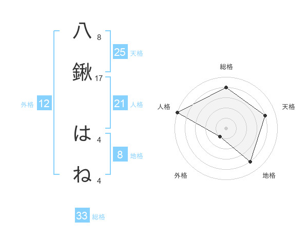 八鍬 はねさんの総格は33画の4点!