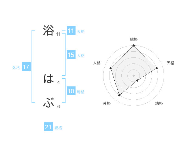 浴 はぶさんの総格は21画の5点!