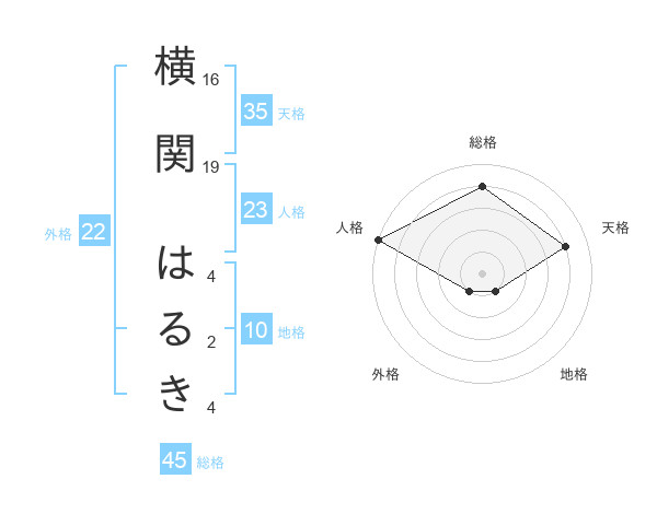 横関 はるきさんの総格は45画の4点!
