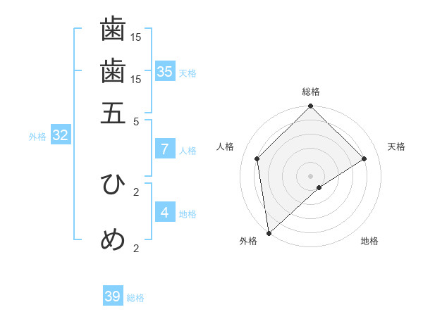 歯歯五 ひめさんの総格は39画の5点!