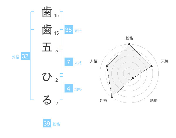 歯歯五 ひるさんの総格は39画の5点!